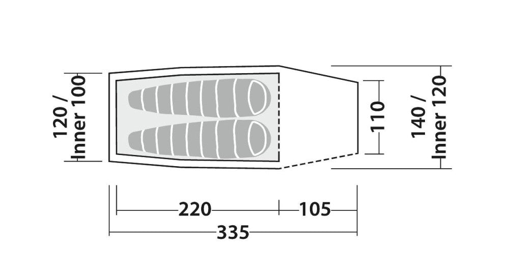 - Atskirti svoriai: išorinis tentas 770 g / vidinė palapinė 555 g / stiebai 410 g
