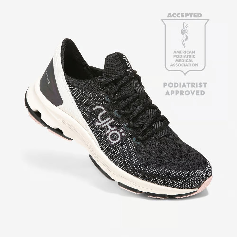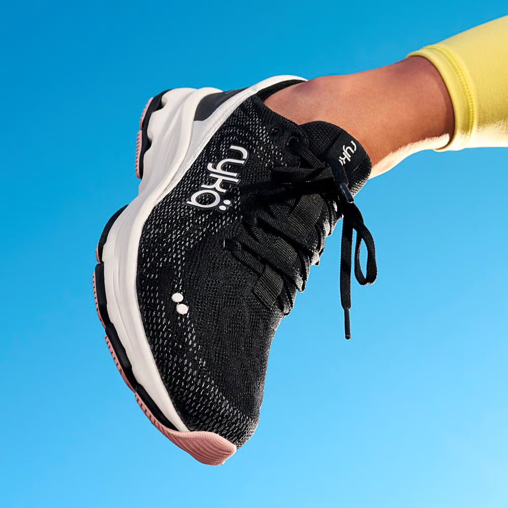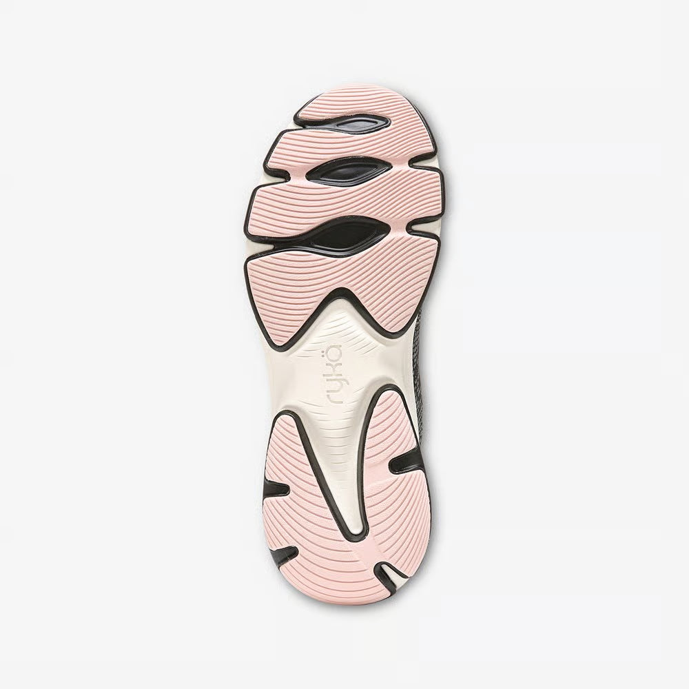 - RYKÄ Q TECH technologija: pritaikyta moters keturgalvio raumens Q kampui – siauresnis kulnas, platesnė pirštų zona ir kontūruota amortizacija stabilumui