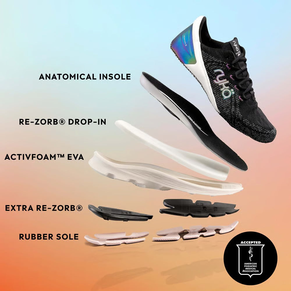 - Tarpinis padas: ACTIVfoam™ EVA minkštai amortizacijai + sustiprinta vidurinė pėdos dalis stabilumui. Pilno ilgio RE-ZORB® amortizacija smūgių sugėrimui ir apsaugai, papildomai RE-ZORB® priekyje ir kulne