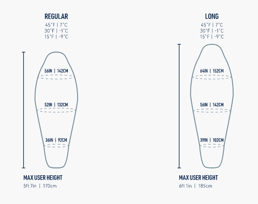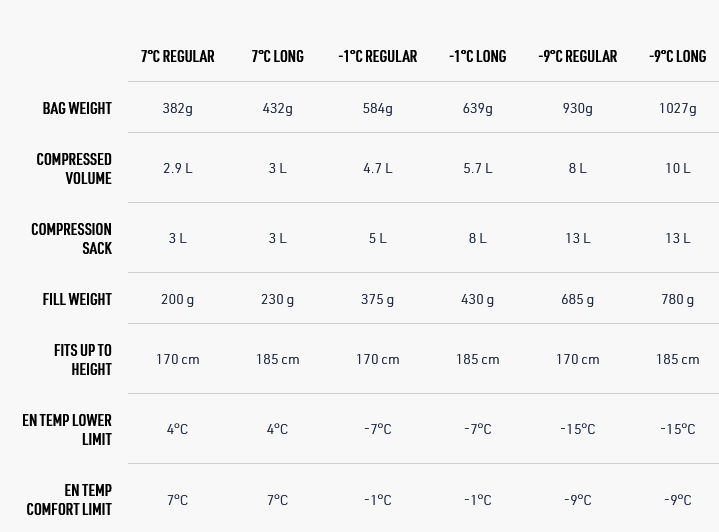 - Siūlių konstrukcija pritaikyta pagal paskirtį: per visą ilgį siūtas lengvesniam svoriui (7°C | 45°F), kombinuotos kameros liemens srityje / siūtas per kojų zoną (-1°C | 30°F) arba pilnos kameros maksimaliai šilumai (-9°C | 15°F).