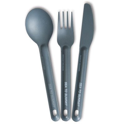 AlphaLight™ karote, dakša un naža galda piederumu komplektā ir izmantots izturīgs alumīnijs gludā, taču stingrā formā, lai izveidotu īpaši vieglu piederuma komplektu.