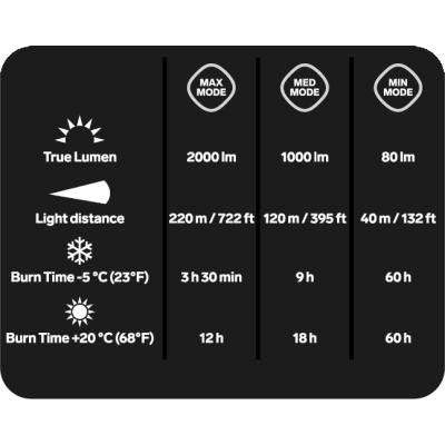 - Pastiprināšanas režīms (2200 lūmeni) — nodrošina īpaši jaudīgas gaismas palielinājumu, ja nepieciešama labāka redze.