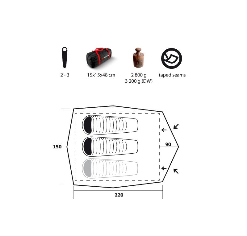 Telts 2 - 3 personām. Tai ir dūralumīnija konstrukcija, un tā ir īpaši gara, lai nodrošinātu lielāku komfortu. Plašajā verandā ir vieta bagāžai. Tās nelielais svars un ātra uzcelšana ir tās galvenās priekšrocības.